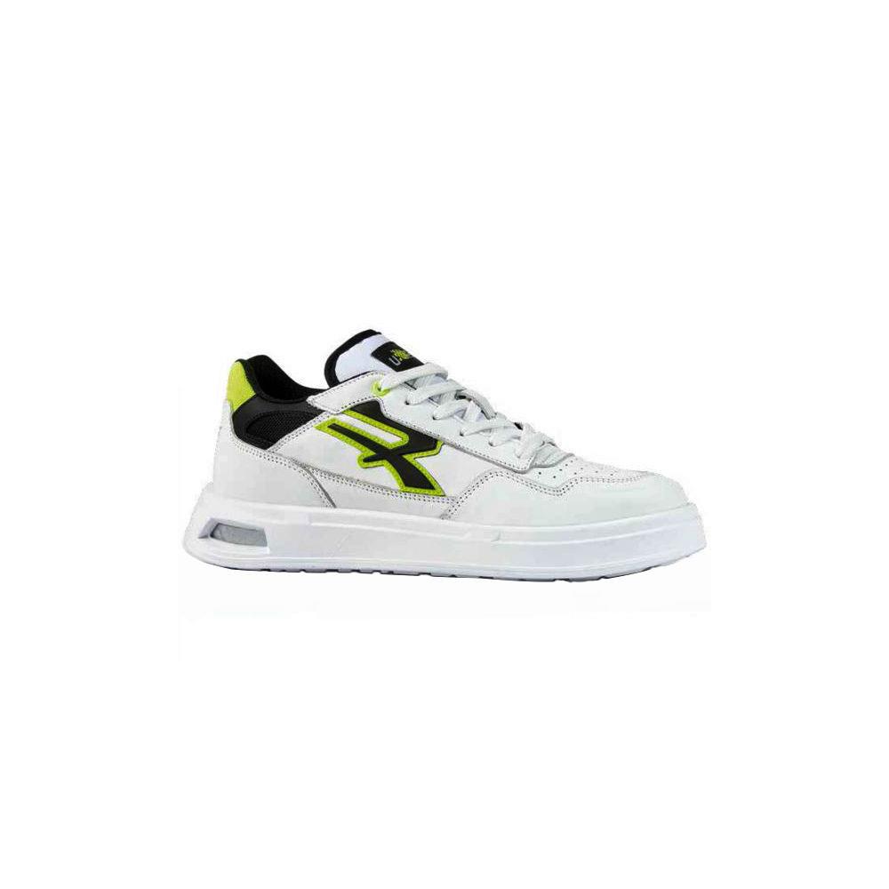 Tomaia pelle e nylon Fodera interna mesh traspirante Linguetta tessuto Suola PU compatto Puntale traforato Coprisottopiede pelle Inserto defaticante Infinergy BASF Protezione classe OB SR - EN 20347:2022 Colore bianco inserti nero/verde fluo