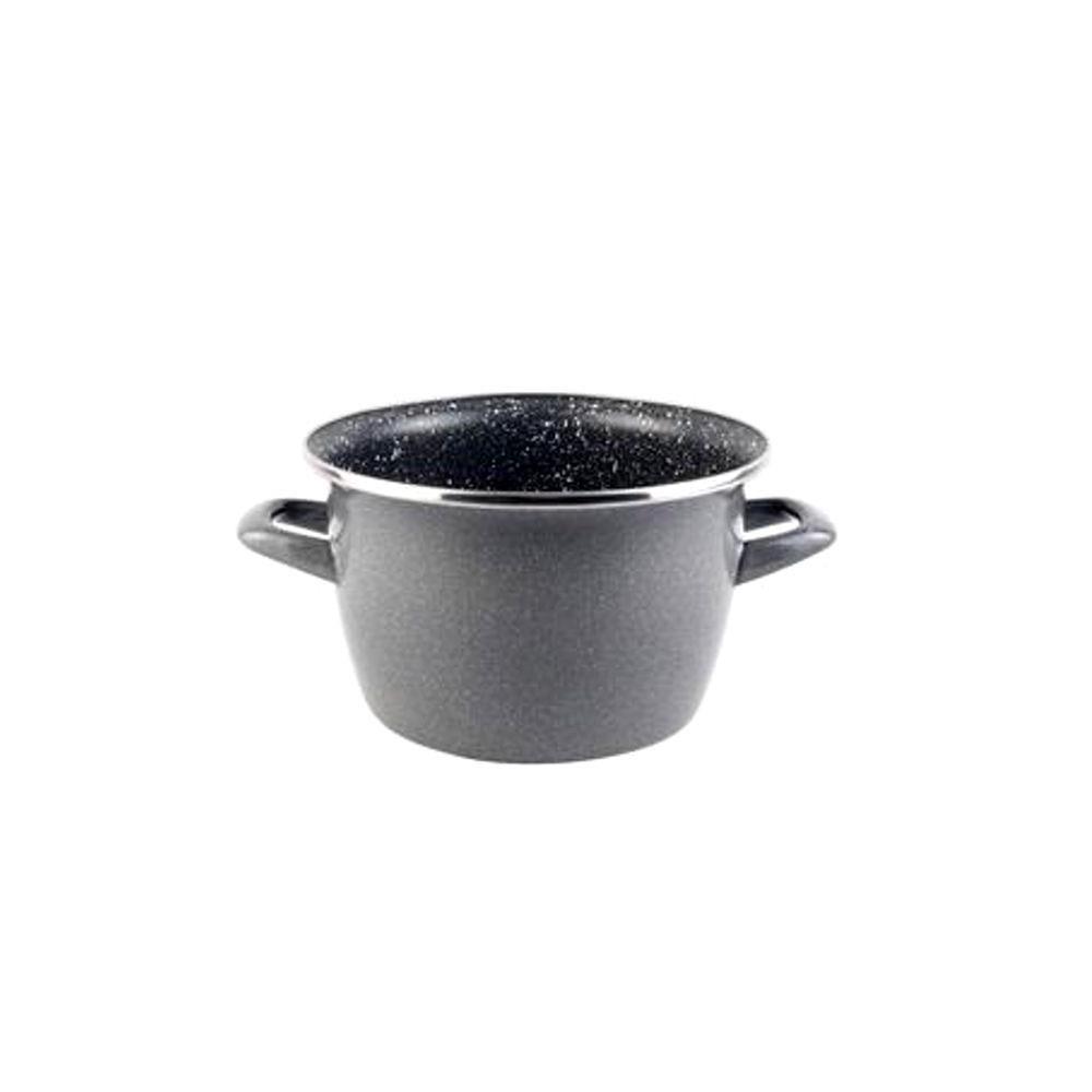 Acciaio smaltato vetrificato - Spessore mm 1,0/1,2 Esterno colore grigio Interno antiaderente nero effetto pietra Manici acciaio smaltato Adatta per induzione e tutte le fonti di calore