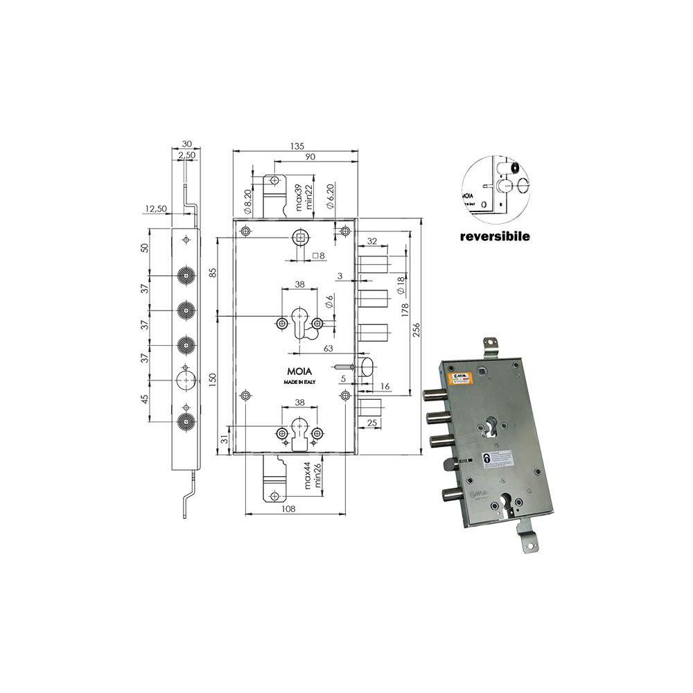 Serratura doppio cilindro europeo a planare Movimento ad ingranaggi Trappola anti effrazione - Foriprotettore mm 38 2 chiusure verticali Catenacci laterali 4 pistoni e scrocco reversibile Interasse catenacci mm 37 Scrocco azionato da maniglia quadro mm 8 e chiave Scatola mm 132x254x30 - Entrata mm63 Cilindri non inclusi