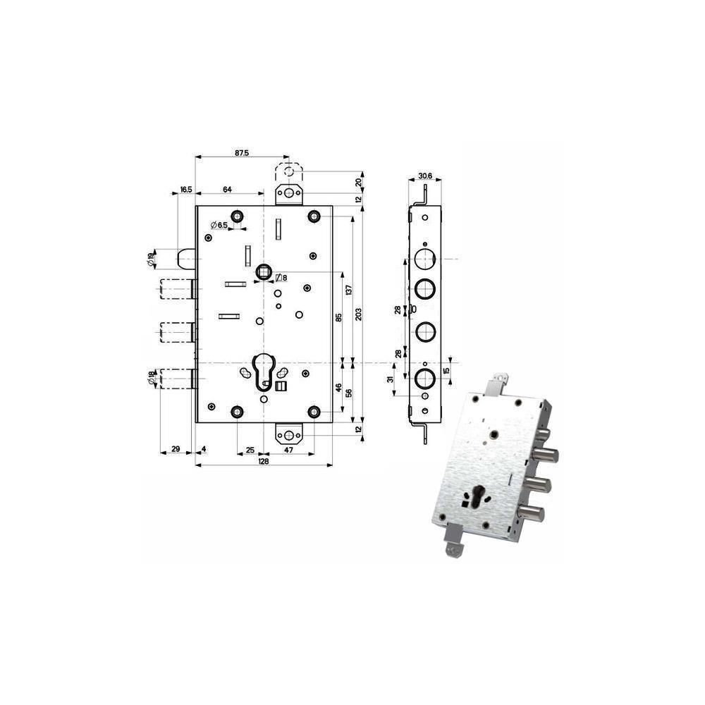 Serratura cilindro europeo a planare Trappola anti effrazione - Fori protettore mm 38Movimento ad ingranaggi 2 chiusure verticali Catenacci laterali 3 pistoni e scrocco Interasse catenacci mm 37 Scatola mm 128x203x31 - Entrata mm 64 Cilindro non incluso