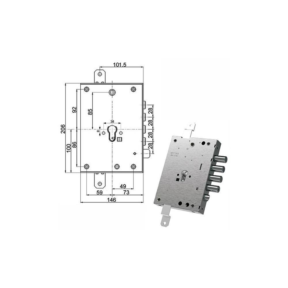 Serratura cilindro europeo a planare Trappola anti effrazione - Fori protettore mm 38Movimento ad ingranaggi 2 chiusure verticali Catenacci laterali 4 pistoni e scrocco Interasse catenacci mm 28 Scatola mm 146x206x30 - Entrata mm 73 Cilindro non incluso