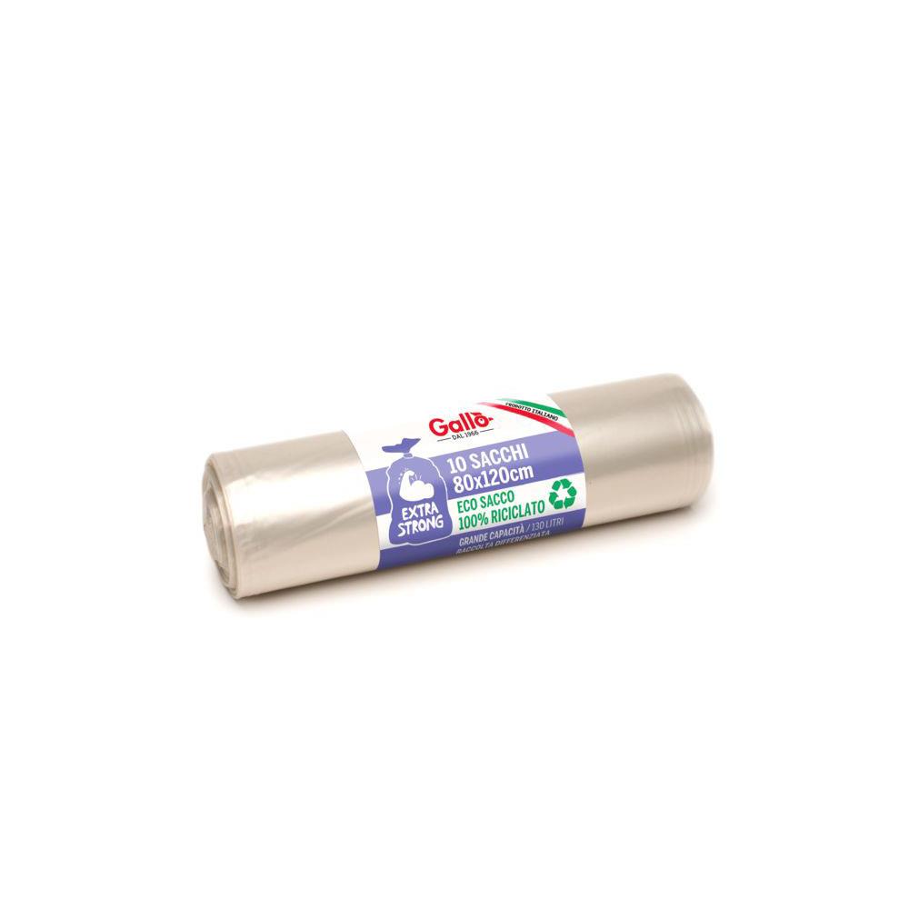 Materiale riciclato 100% - Resistenza media Fondotenuta liquidi - Saldatura a stella Lacci di chiusura - Confezione salvaspazio Dimensioni cm 80x120 peso g 60 my 35