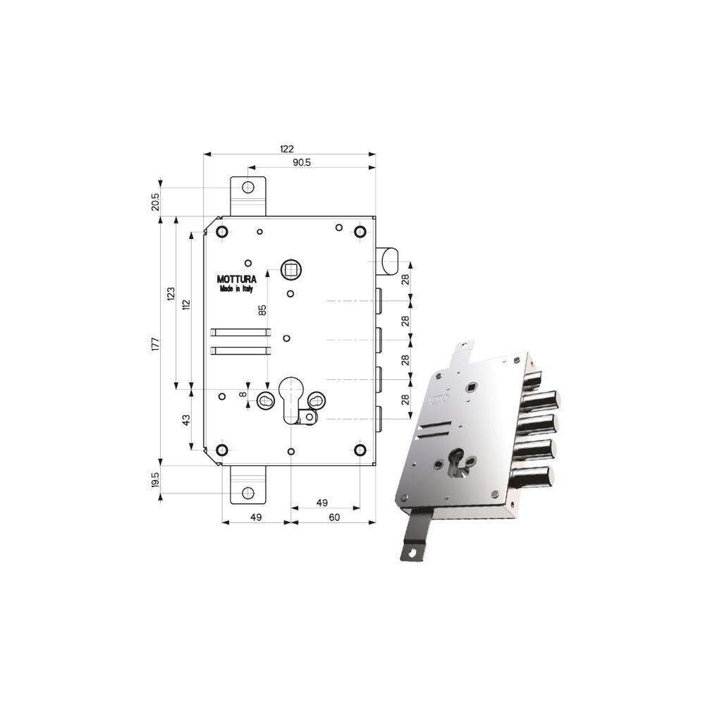 Serratura cilindro europeo a planare Movimento ad ingranaggi 2 chiusure verticali Catenacci laterali 4 pistoni e scrocco Interasse catenacci mm 28 Scatola mm 122x177x35 - Entrata mm 60 Cilindro non incluso