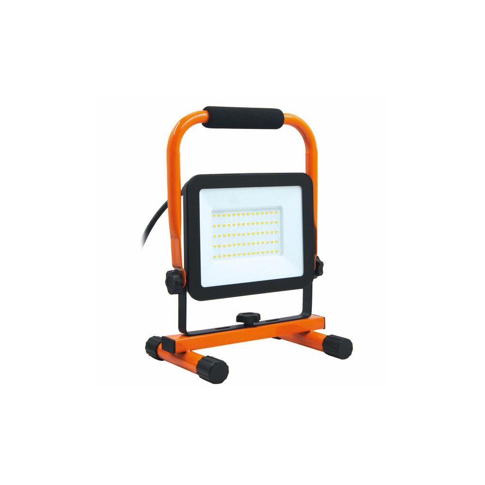 Modello portatile con supporto da appoggio Corpo alluminio pressofuso Vetro temprato rettangolare Luce fredda 4000K Fascio luce 120^ Protezione lampada IP65 - Protezione spina IP44 Supporto acciaio Colore arancione