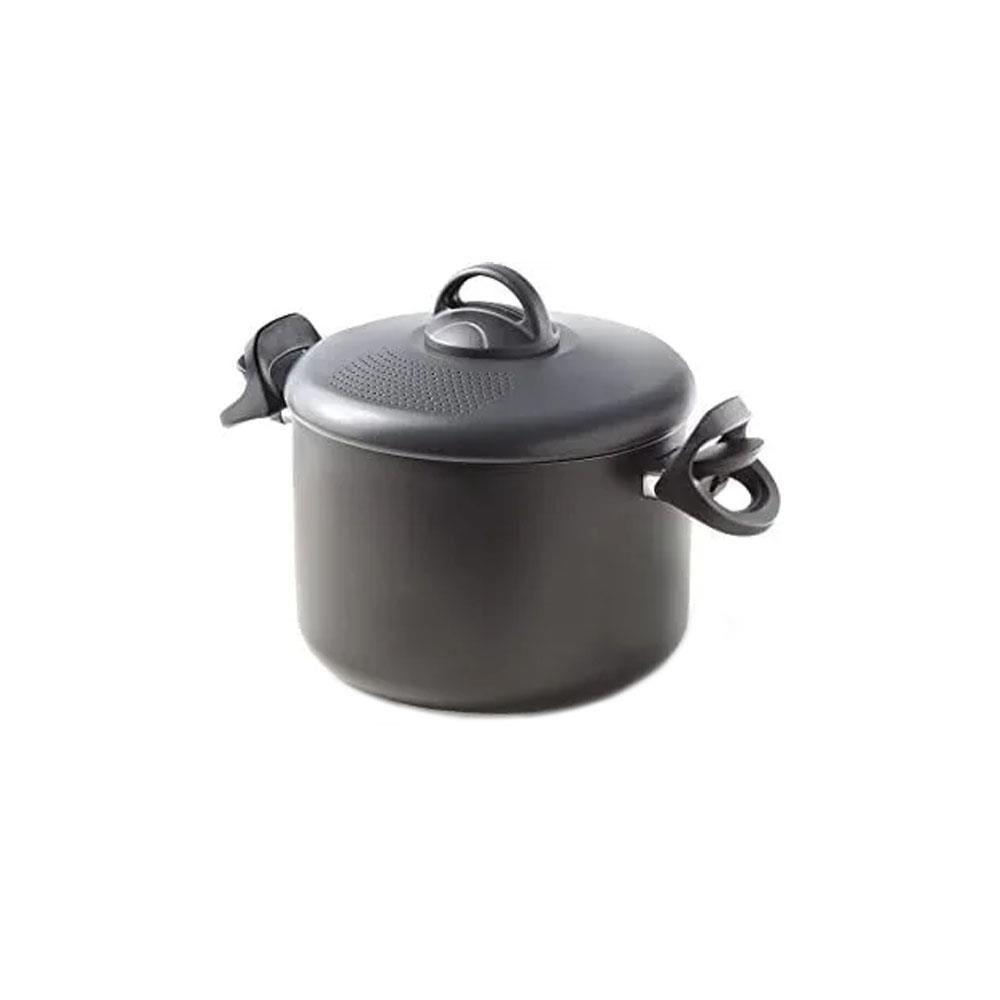 Alluminio - Spessore mm 2 Esterno lacca siliconica colore nero satinato Interno antiaderente AM Salus Extra Strong Manici bachelite autobloccanti Coperchio forato lateralmente Permette di scolare e condire nella pentolaGaranzia 2 anni