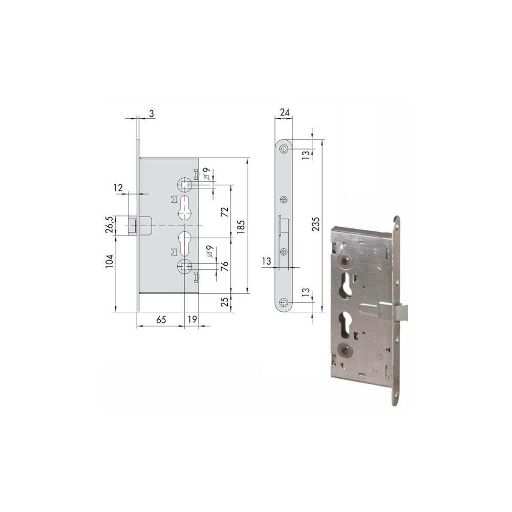 Serratura porte tagliafuoco infilare Zincata - Scrocco Q9 Funzionamento esterno scrocco azionato da chiave o da maniglia se abilitatada chiave Predisposizione chiusure supplementari Scatola 84x185 Frontale mm 24x235 - Entrata mm 65 Cilindro non incluso Abbinabile maniglioni antipanico Cisa 59600/59711