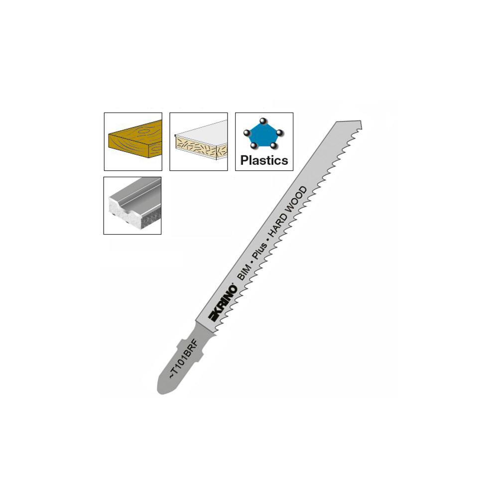Lama seghetto alternativo dentatura inversa Attacco tipo Bosch Acciaio HCS bimetallico rettificato Lunghezza mm 100 - Passo denti mm 2,5 Utilizzo su:Legno e multistrato < mm 30 Plastica lastre < mm 25 e profili < mm 50 Pannelli sandwich < mm 45