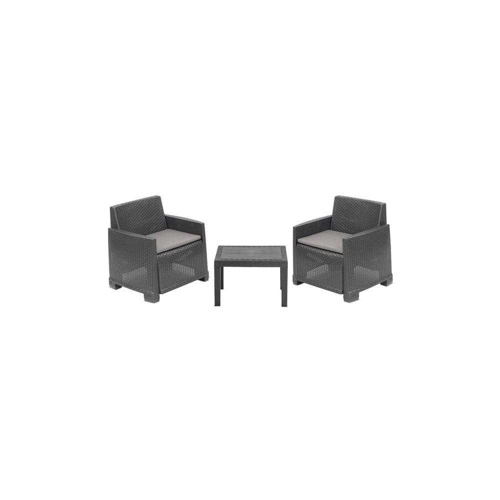 Resina Cuscini colore grigio Composizione: 2 poltrone cm 72x66 h 74 1 tavolino cm 59x46 h 40 Resiste agli agenti atmosferici/muffe/smog/polvere Non adatto ad utilizzo professionale