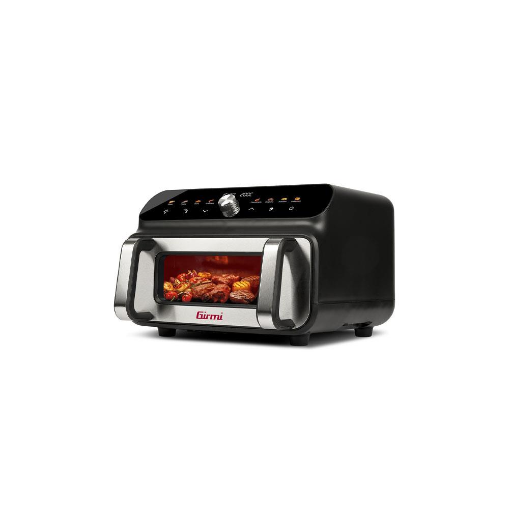 Watt 2000 - Capacita' l 10,0 Controllo temperatura 50^/230^ 8 programmi di cottura Timer 60 minuti - Display digitale Luce interna - Oblo' frontale - Doppia resistenza Dotazione teglia tonda, griglia frittura e griglia barbecue Multifunzione: friggitrice, forno, essiccatore e barbecue Dimensioni cm 37,5x48 h 26