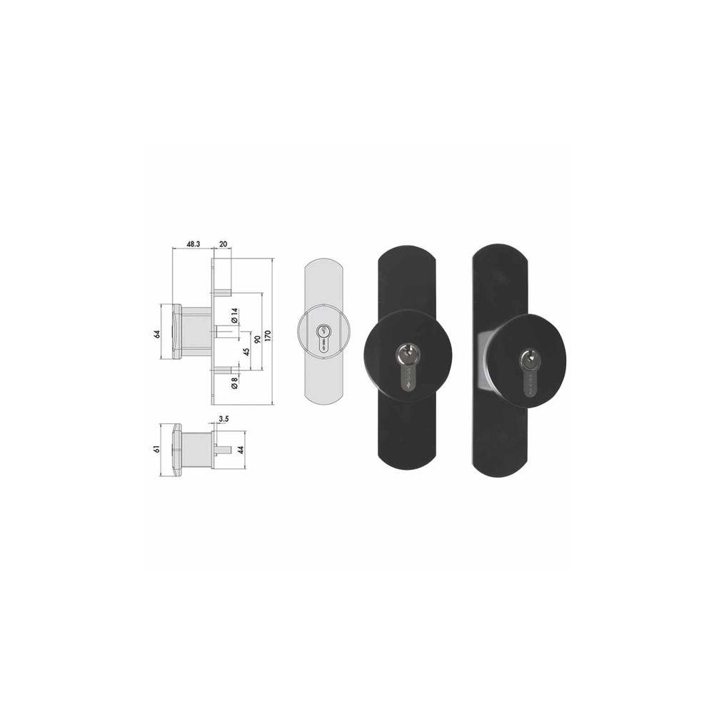 Pomolo fisso e placca alluminio verniciato nero Completo di cilindro incorporato Azione chiave su scrocco Interasse mm 90 Adatto maniglioni Cisa 1 punto di chiusura