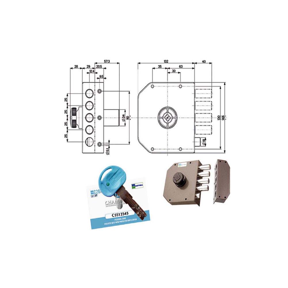 Serratura pompa applicare legno Chiusura laterale - Pomolo interno Catenacci laterali 4 pistoni e scrocco Misura scatola mm 132x146x30 - Entrata mm 63 Diametro cilindro mm 34 lunghezza mm 50 3 chiavi CP8 cod.84293 Profilo riservato Machieraldo