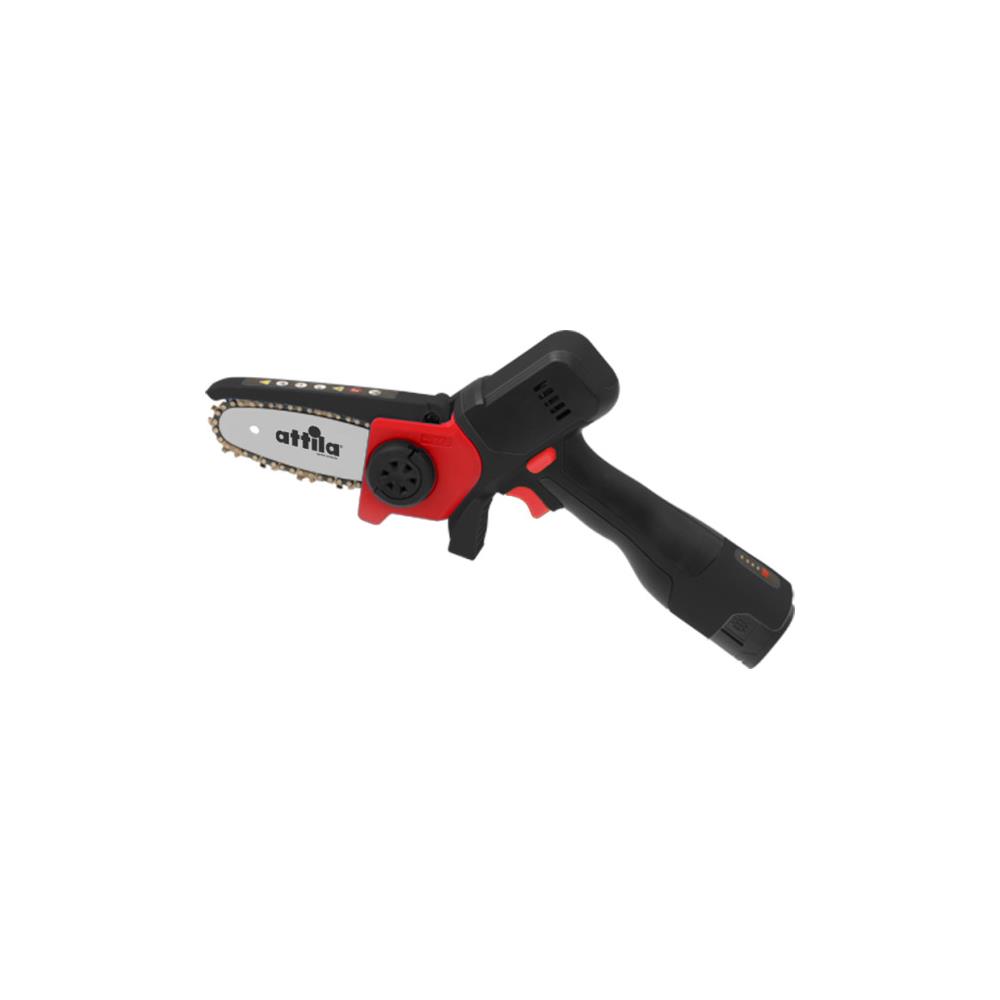 con barra cm.10 (4"), motore brushless 14,4V - 2 batterie da 1,5Ah - impugnatura ergonomica con paramano inferiore di sicurezza, tendicatena manuale, diametro massimo di taglio mm.80, autonomia 25min, peso kg.0,90 (batteria esclusa). Dotazione: 2 batterie litio 14,4V 1,5Ah - caricabatterie, protezione barra e catena, boccetta olio lubrificante, valigetta