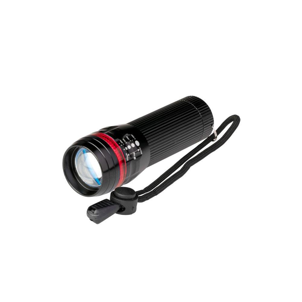 Corpo alluminio 1 led watt 1 lumen 80 Fascio luceANSI m 50 Grado di protezione IP44 - Lacciolo polso Funzioni: illuminazione alta, bassa e strobo Alimentazione 3 pile ministilo AAA non incluse Dimensioni mm 32x100