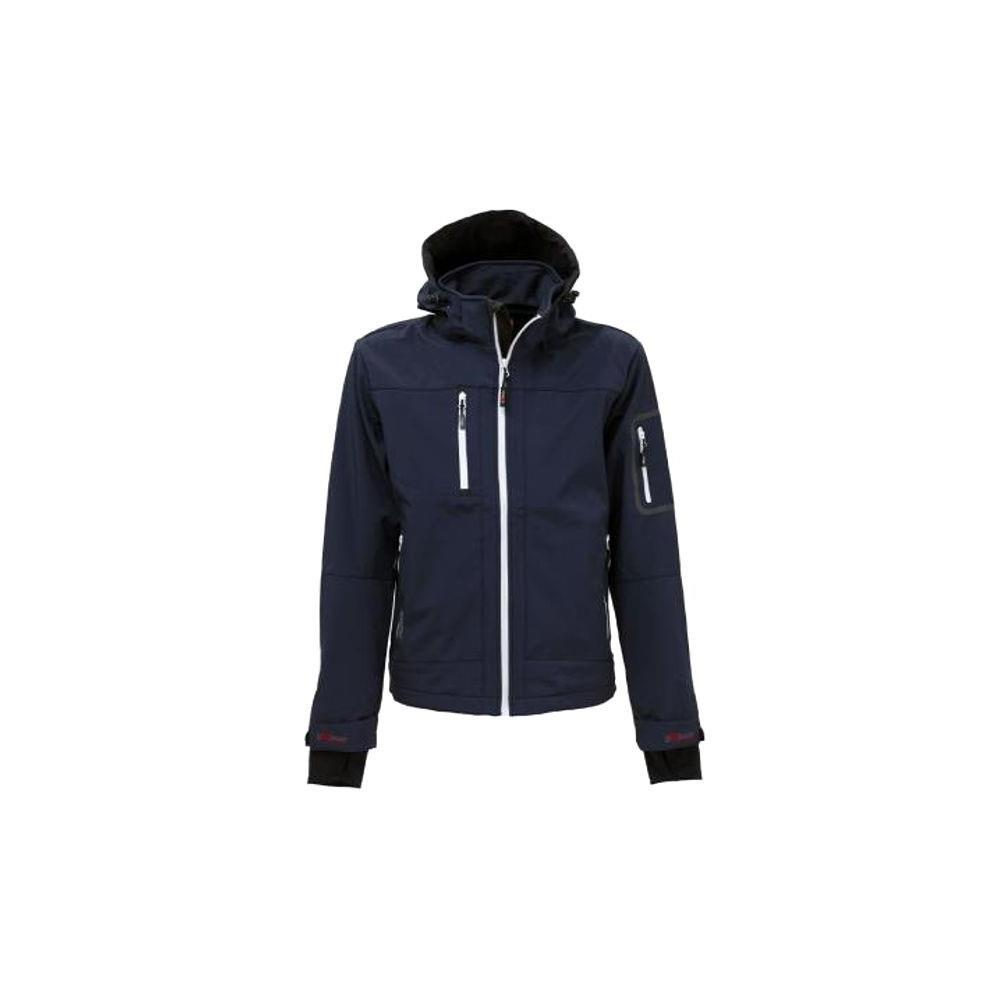 Softshell poliestere 100% g/mq 320 Imbottitura micropile g/mq 160 Chiusura zip lunga 2 tasche frontali con zip Tasca portacellulare e su braccio con zip Polsini regolabili con velcro - Girovita sagomato Polsini antivento elasticizzati con passapollice Collo alto - Cappuccio regolabile e staccabile Colore blu scuro inserti bianco