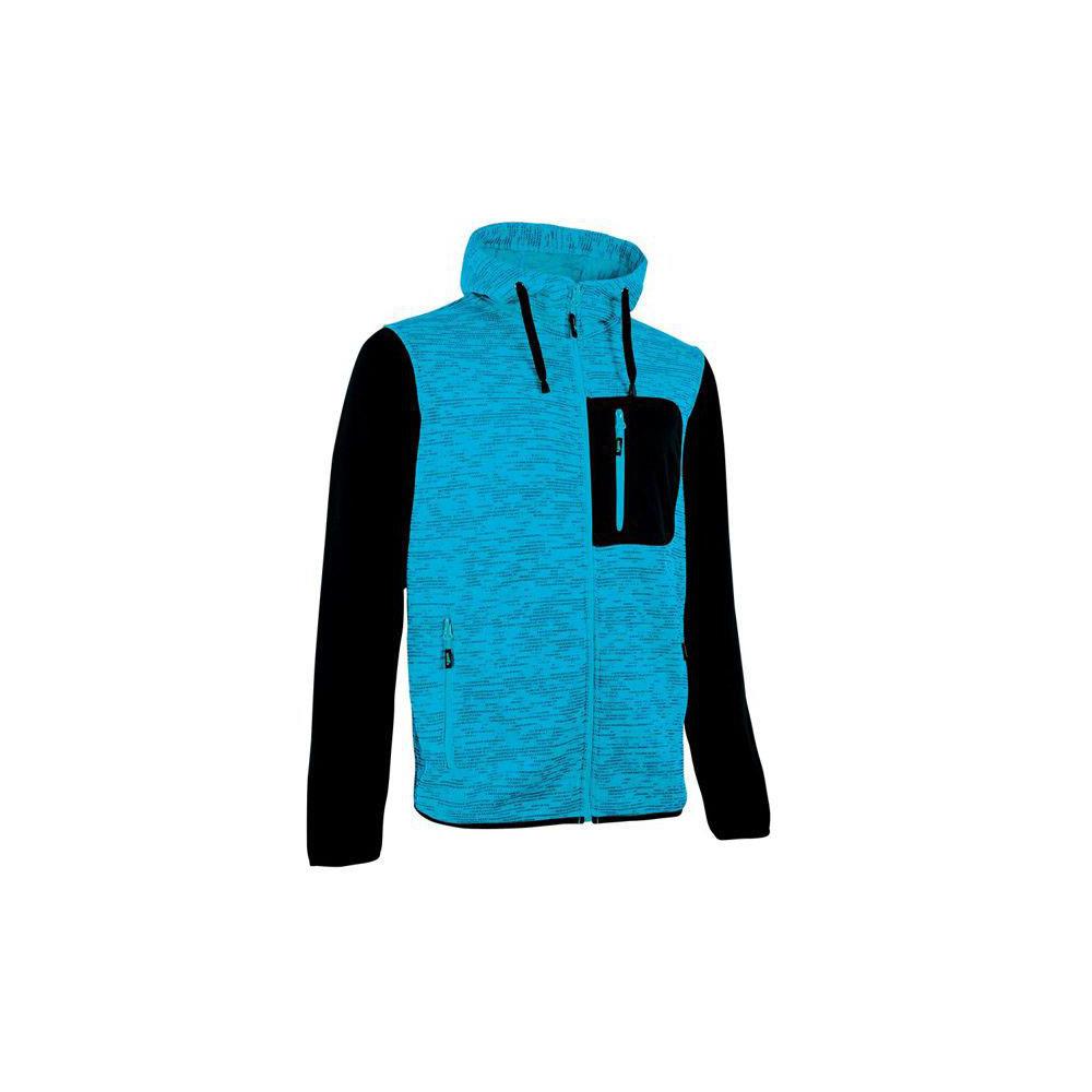 Poliestere 100% g/mq 310 Tessuto interno pile Chiusura zip lunga Polsi e fascia girovita maglia elastica Collo alto - Cappuccio regolabile 2 tasche frontali con zip Tasca portacellulare con zip Colore ciano fluo