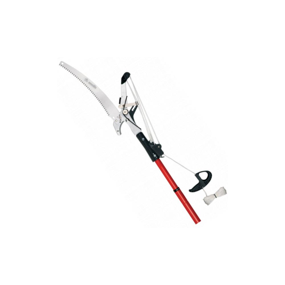 Taglio semplice lama acciaio al carbonio Struttura acciaio verniciato Manico acciaio telescopico cm150/300 Attacco morsetto Q-neck Dotazione segaccio e cordino nylon Capacita' taglio max mm 25