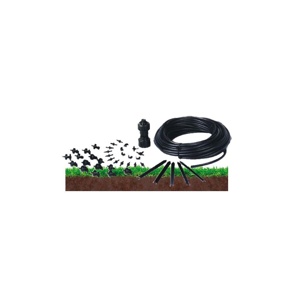 Sistema irrigazione a goccia e microirrigazione Adatto per irrigazione vasi Dotazione completa per 15 punti irrigazione Composizione: tubo flessibilemm 4 m 20, raccordi, rubinetto con riduttore di pressione, gocciolatori terminali e lineari, connettori, clip di fissaggio e sostegno