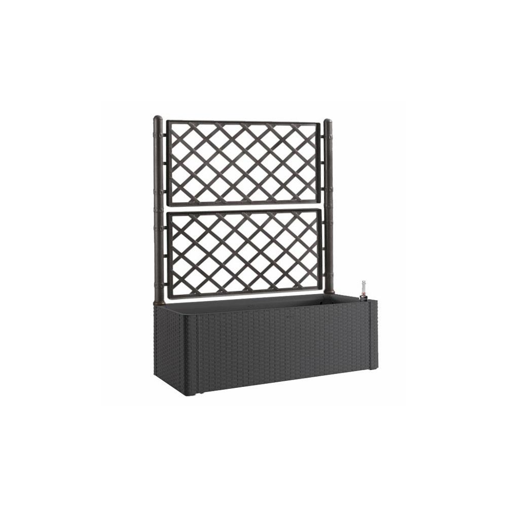 Struttura plastica resistente colore antracite Dimensioni cm 100x43 h 142 Decoro design simil rattan Spalliera grigliata colore antracite Riserva acqua con indicatore di livello Adatta per rampicanti