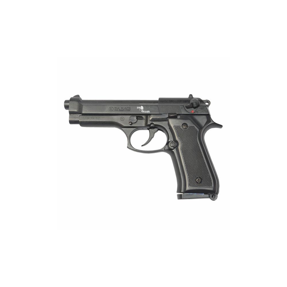 Pistola a salve modello semi automatico Strutturazama verniciata colore nero Calibro mm 8 - Caricatore bifilare 16 colpi Sfogo fiammata Top Firing Dimensioni cm 21,5 h 13,7 - Peso g 1100 Conforme nota ministeriale n.10 C.N/50 4598-E-81 del 27.01.82seduta n.63 - Libera vendita