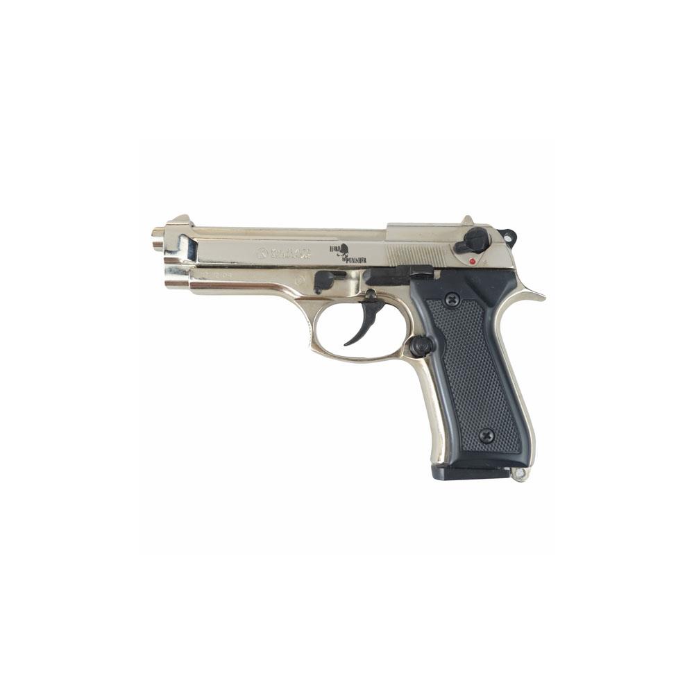 Pistola a salve modello semi automatico Strutturazama cromata Calibro mm 8 - Caricatore bifilare 16 colpi Sfogo fiammata Top Firing Dimensioni cm 21,5 h 13,7 - Peso g 1100 Conforme nota ministerialen.10 C.N/50 4598-E-81 del 27.01.82 seduta n.63 - Libera vendita