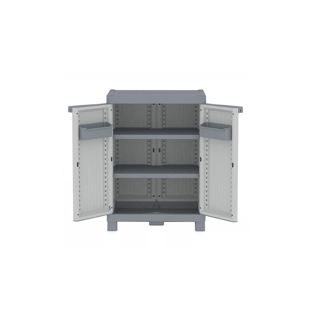 Polipropilene bicolore 2 ante apertura 180^ Predisposizione per lucchetto 2 ripiani regolabili portata kg 30 2 vaschette interne regolabili Strutturae ante colore grigio chiaro Base, tetto, ripiani e maniglie colore grigio Adatto per uso interno edesterno Peso kg 10,35