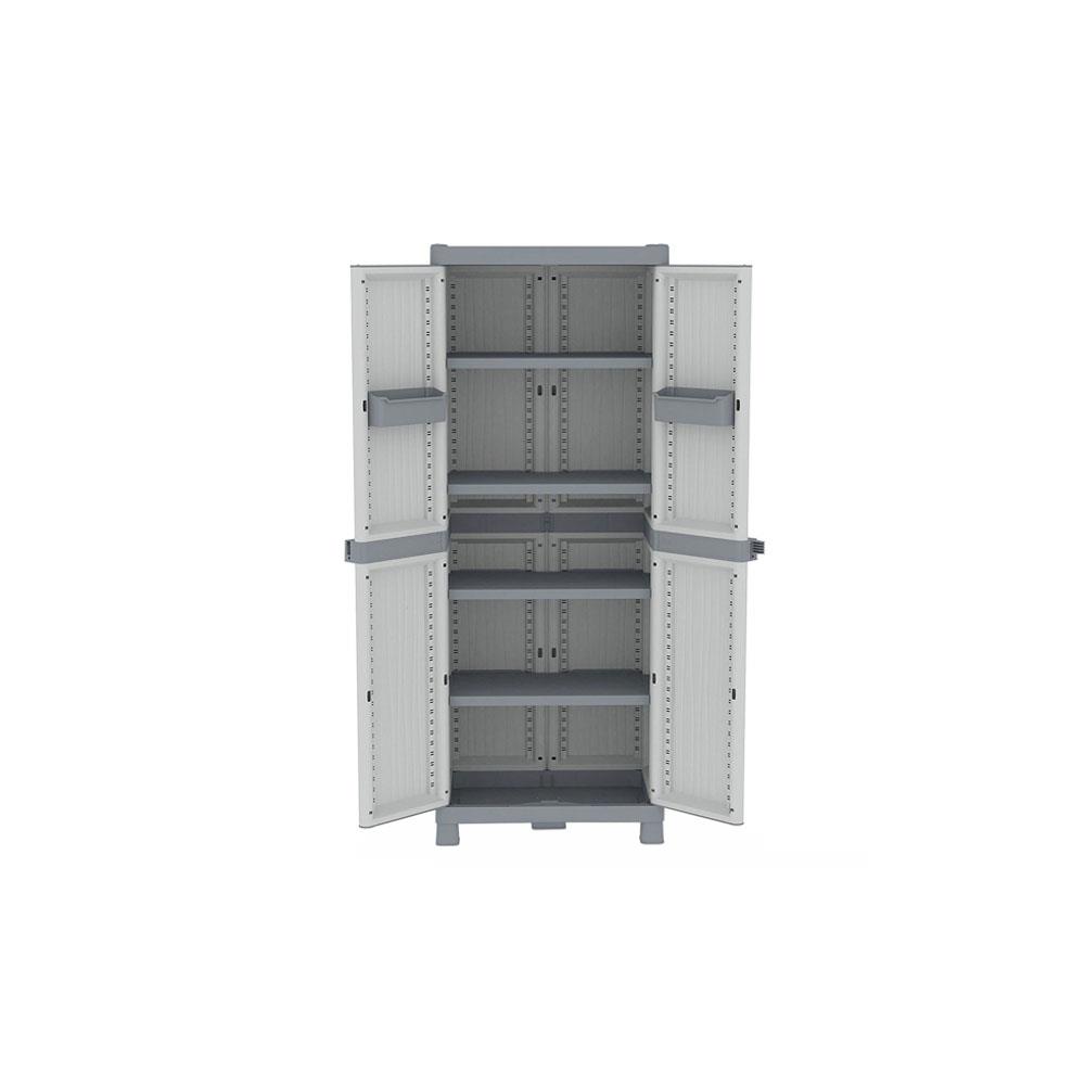 Polipropilene bicolore 2 ante apertura 180^ Predisposizione per lucchetto 4 ripiani regolabili portata kg 30 2 vaschette interne regolabili Strutturae ante colore grigio chiaro Base, tetto, ripiani e maniglie colore grigio Adatto per uso interno edesterno Peso kg 18,20