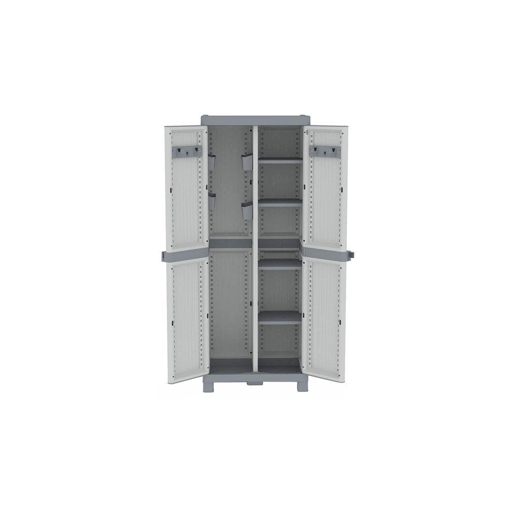 Polipropilene bicolore 2 ante apertura 180^ Predisposizione per lucchetto 4 ripiani regolabili portata kg 15 + portascope 4 vaschette interne regolabili + 2 appentitutto Struttura e ante colore grigio chiaro Base, tetto, ripiani e maniglie colore grigio Adatto per uso interno ed esterno Peso kg 18,70