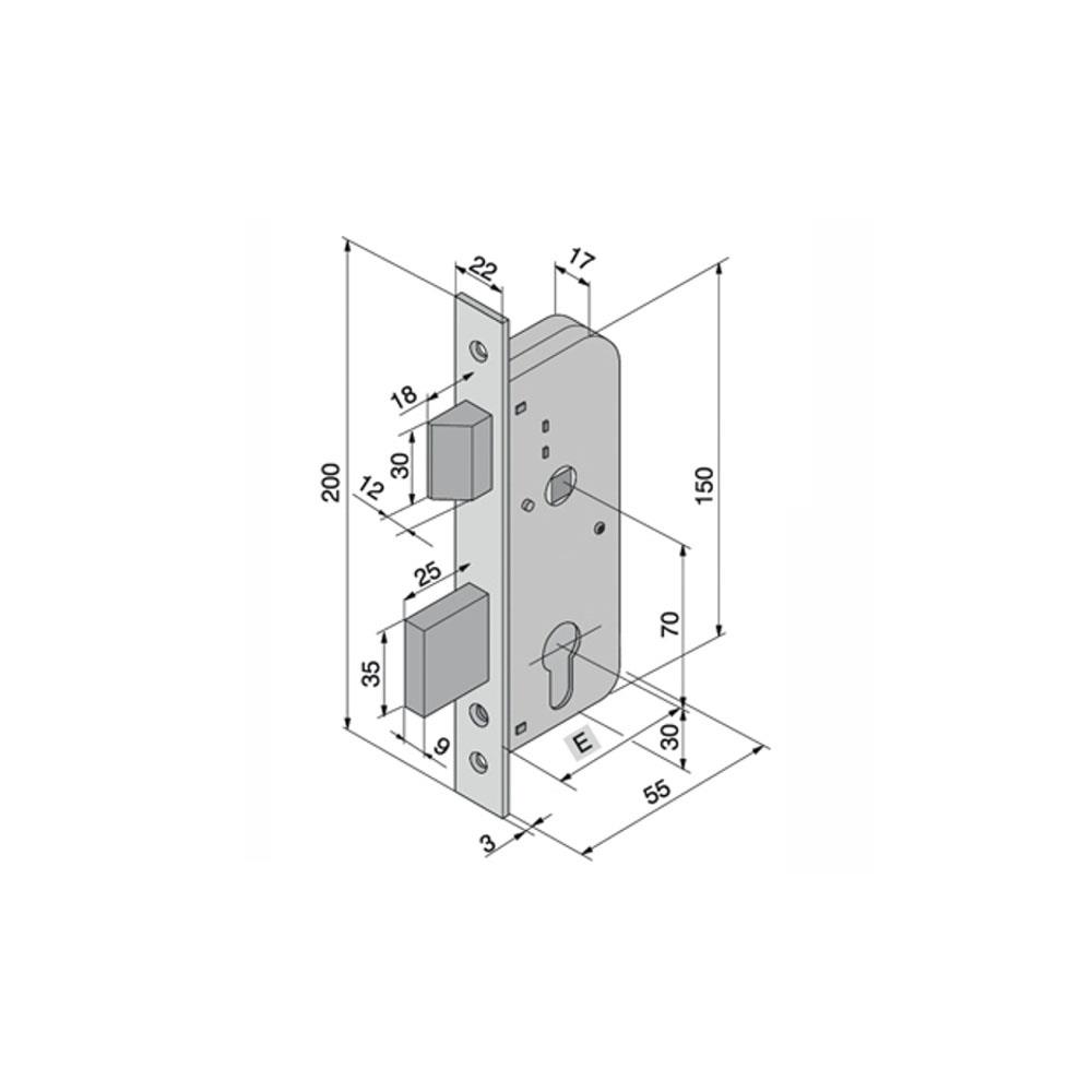 Serratura cancelli/porte ferro infilare Acciaio zincato tropicalizzato - Catenacci mm 25 2 mandate e scrocco reversibile - Quadro mm 8 Scatola mm 55x150 - Frontale mm 22x200 Entrata mm 30 - Cilindro serie 700 non incluso