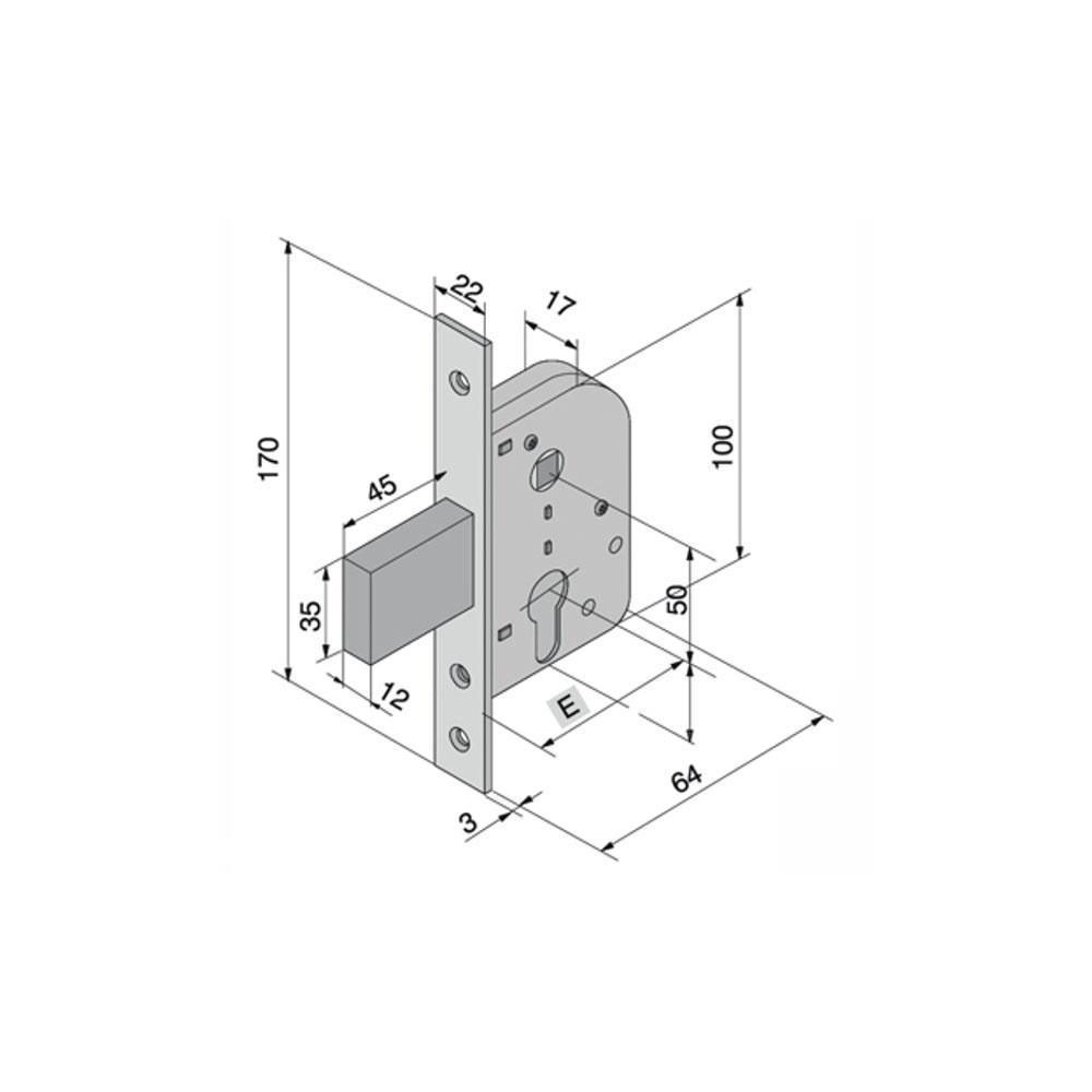 Serratura cancelli/porte ferro infilare Acciaio zincato tropicalizzato Scrocco con dispositivo bloccaggio - Quadro mm 8 Scatola mm 64x100 - Frontale mm 22x170 Entrata mm 30 - Cilindro serie 700 non incluso