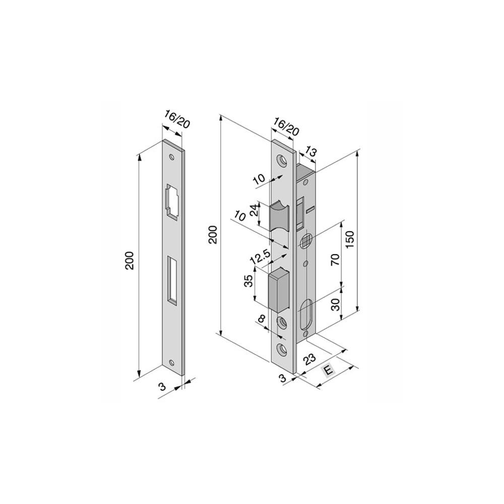Serratura montanti alluminio infilare Acciaio nichelato - Incontro 1 mandata e scrocco reversibile - Quadro mm 8 Scatola mm 23x150 - Frontale mm 16/20x200 Entrata mm 15 - Cilindro serie 700 non incluso