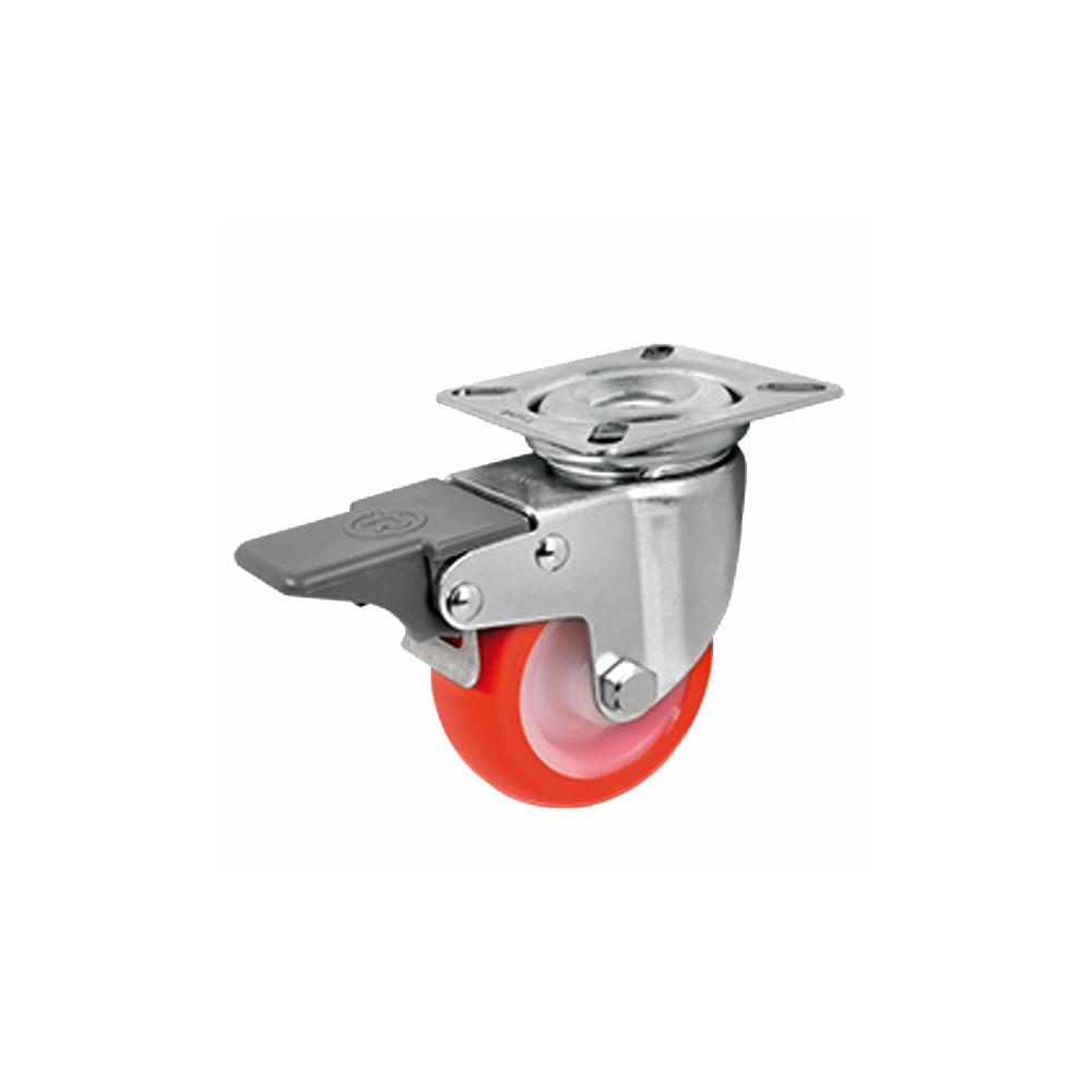 Ruota poliuretano iniettato colore rosso Nucleo poliammide 6 colore bianco Boccola - Supporto leggero girevole - Con freno Adatta in collettivita' e ristorazione d.40 h 61 kg 40 d.50 h 67 kg 55 d.60 h 83 kg 70